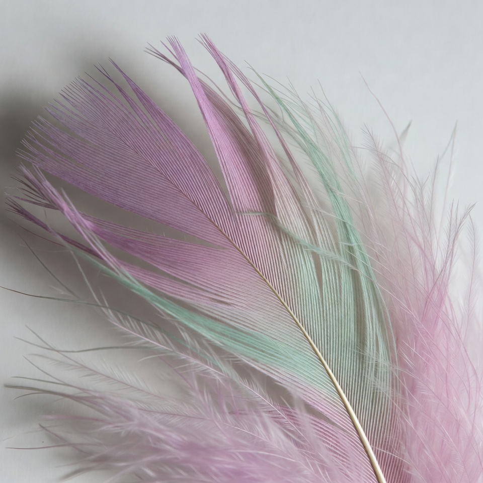 A cluster of soft feathers in shades of pink and green is arranged against a plain white background. The feathers overlap with delicate, fluffy textures and subtle shadows. The image highlights the vibrant colors and intricate details of the plumage.