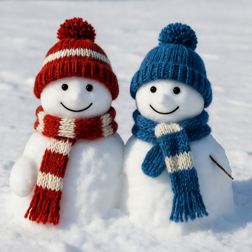Two snowmen stand side by side on a snowy ground. The left snowman wears a red knit hat with a pom-pom and a red and white striped scarf. The right snowman has a blue knit hat with a pom-pom and a blue and white striped scarf, both with cheerful smiles and black eyes.
