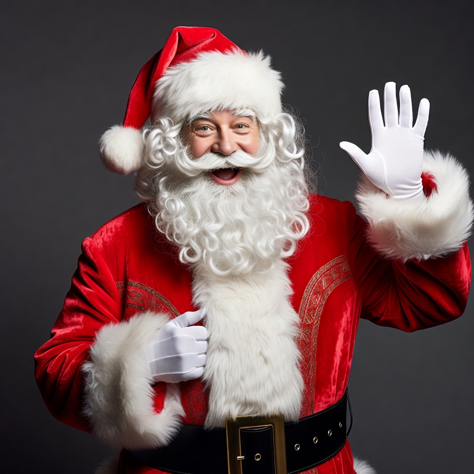 A cheerful man dressed as Santa Claus stands against a dark background, wearing a red velvet suit with white fur trim and a matching hat. He has a long white beard and mustache, and is waving with his gloved right hand raised high. His suit features gold embroidery and a wide black belt.