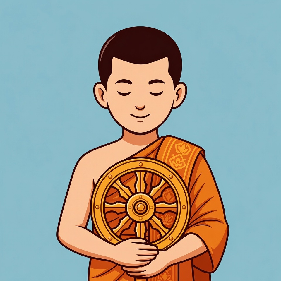 Asian, Buddhist, Dharma wheel, Dharmachakra, blue background, boy, cartoon, clipart, closed eyes, gold wheel, illustration, isolated background, meditation, novice monk, orange robe, serene, smiling, young monk, monk