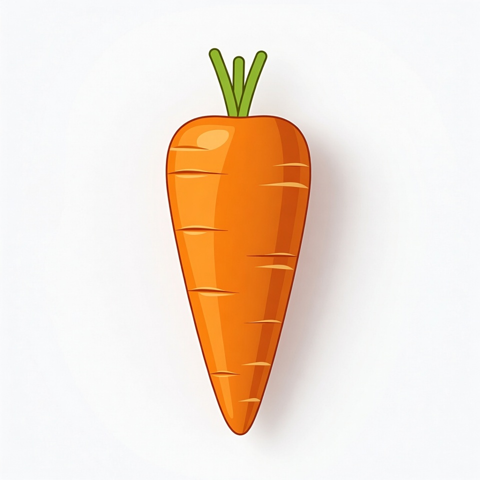 A vibrant orange carrot illustration with green tops is centered on a plain white background. The carrot features smooth shading and subtle textures on its tapered body. It is depicted in a simple clipart style.