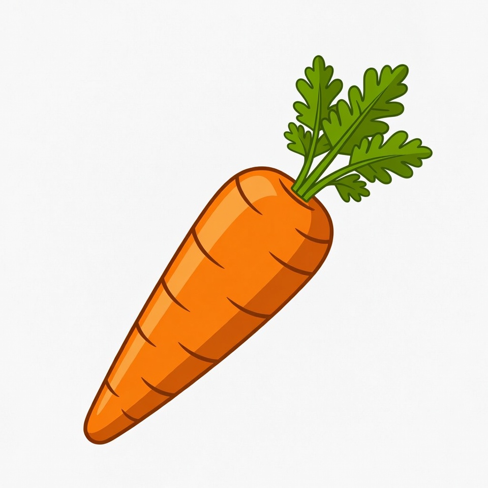 A vibrant orange carrot with green leafy tops is illustrated in a cartoon style. It stands upright on a white isolated background. The carrot features smooth curves and detailed green fronds.