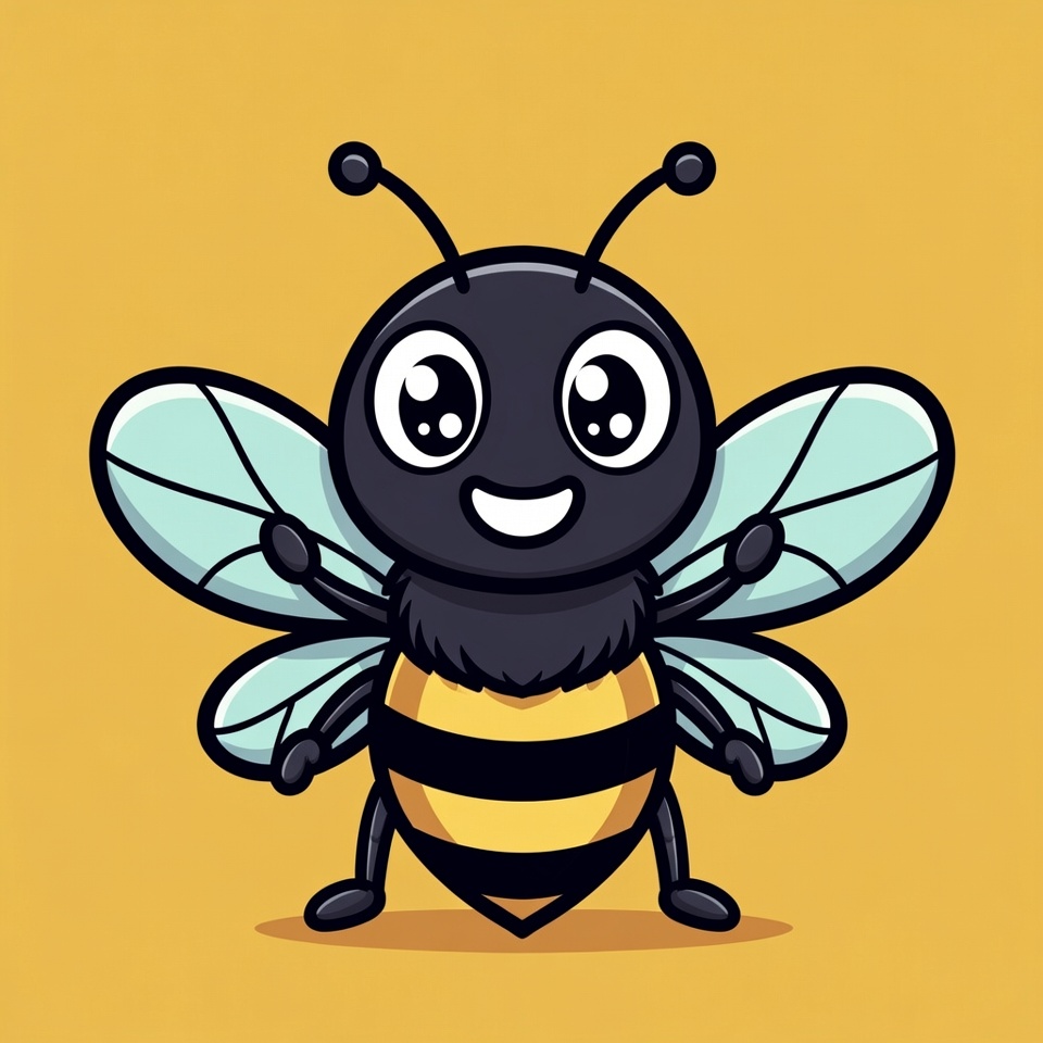 animal illustration, bee illustration, big eyes, black bee, cartoon bee, chibi bee, clipart, fluffy bee, happy bee, isolated background, kawaii bee, smiling bee, translucent wings, vector art, yellow background, yellow stripes, cute bee