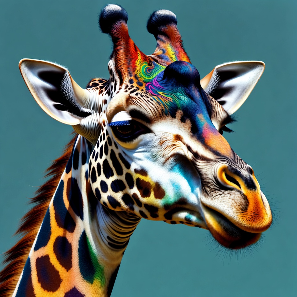 A giraffe with vibrant, multicolored psychedelic patterns on its fur faces forward against a solid teal background. Its ossicones, ears, and face feature rainbow hues blending into the traditional spotted coat. The detailed rendering highlights expressive eyes and a slightly open mouth.