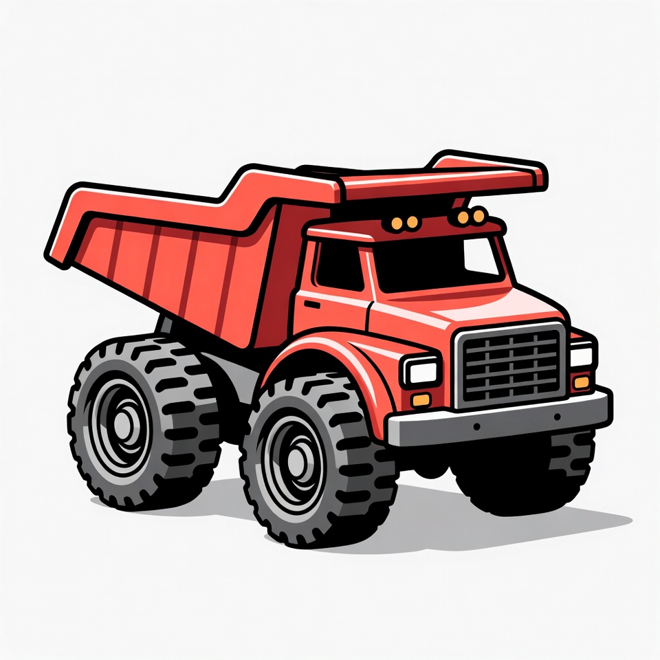 A vibrant red dump truck with a raised bed is depicted in a colorful cartoon style. It features large black tires, headlights, and orange lights on an isolated white background. The illustration has a playful, bold outline design.