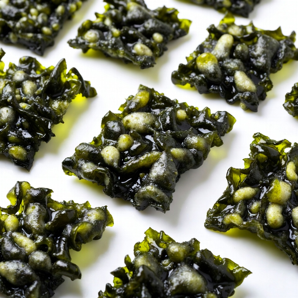 Multiple green seaweed snacks topped with small white beans are arranged in a grid on a white background. Each crispy snack has an irregular shape with seaweed crisped around the beans. The snacks are evenly spaced and isolated for a clean presentation.