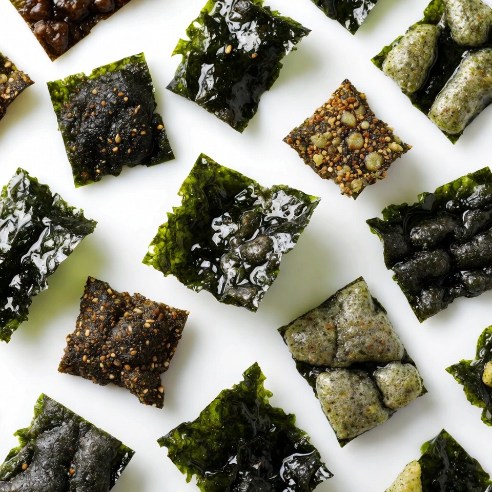 A flat lay of various seaweed snacks arranged on a white surface. The snacks include green kelp sheets, dark roasted nori squares topped with sesame seeds, and green paste-filled pieces. They are displayed in a scattered grid pattern for visual appeal.