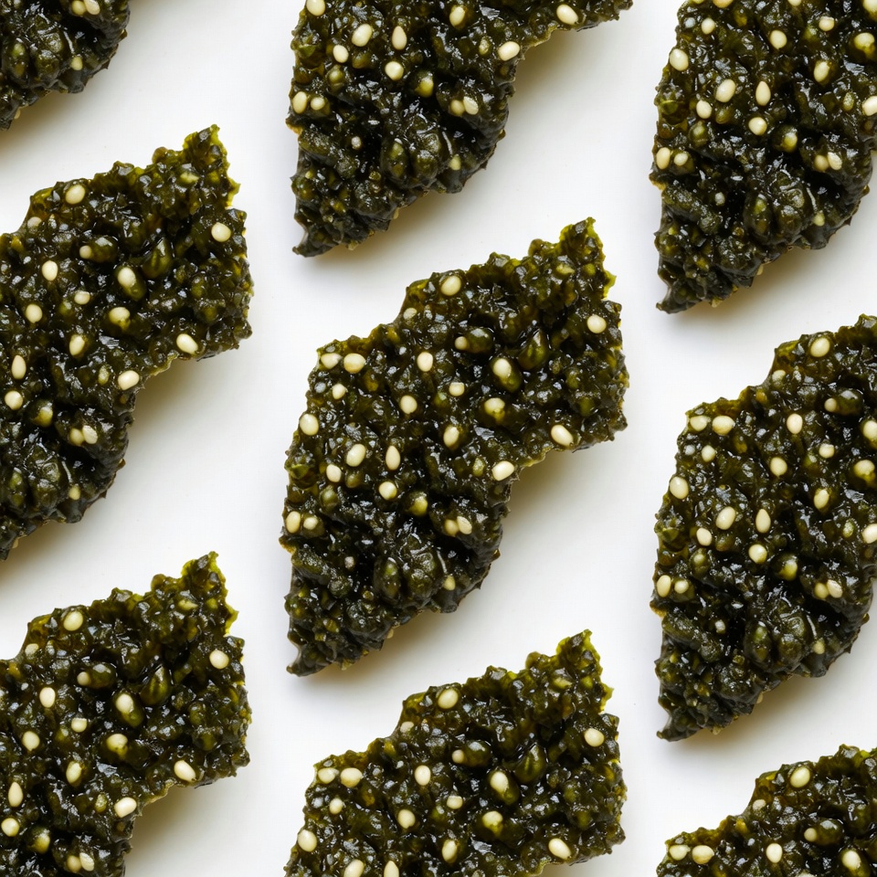 Asian snack, food photography, green seaweed, grid arrangement, healthy snack, isolated background, nori, seed topping, sesame coated, sesame seeds, textured seaweed, top view, vegan food, white background, seaweed snacks