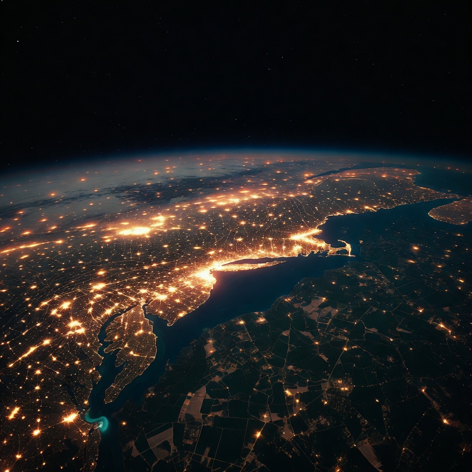 East Coast, North America, aerial view, atmosphere, city lights, clouds, coastline, dark ocean, geography, global, glowing cities, illuminated, lights, night view, nighttime, planet, satellite image, space photography, urban glow, Earth