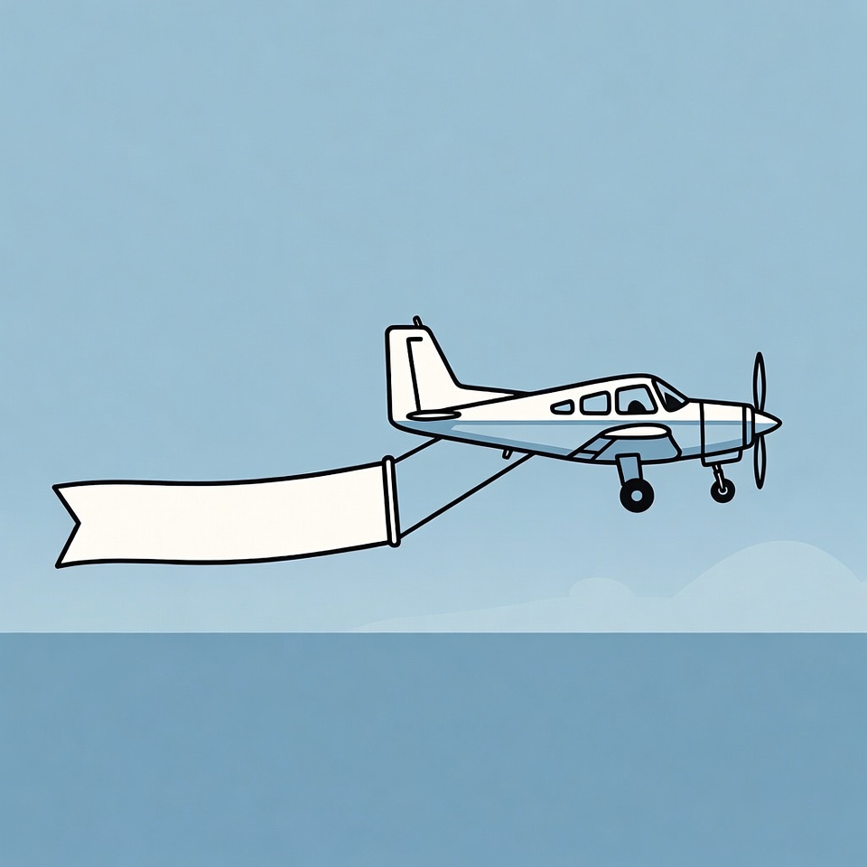 A simple line art illustration of a small propeller airplane flying over a blue sky and water. The white airplane has a long white blank banner trailing behind it, attached by strings. The scene features a clean, isolated blue background.