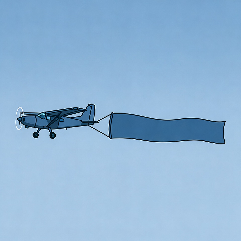 A blue cartoon airplane flies across a clear sky while towing a long blank blue banner. The propeller plane has simple line art details and landing gear. The banner trails behind on strings against the isolated blue background.