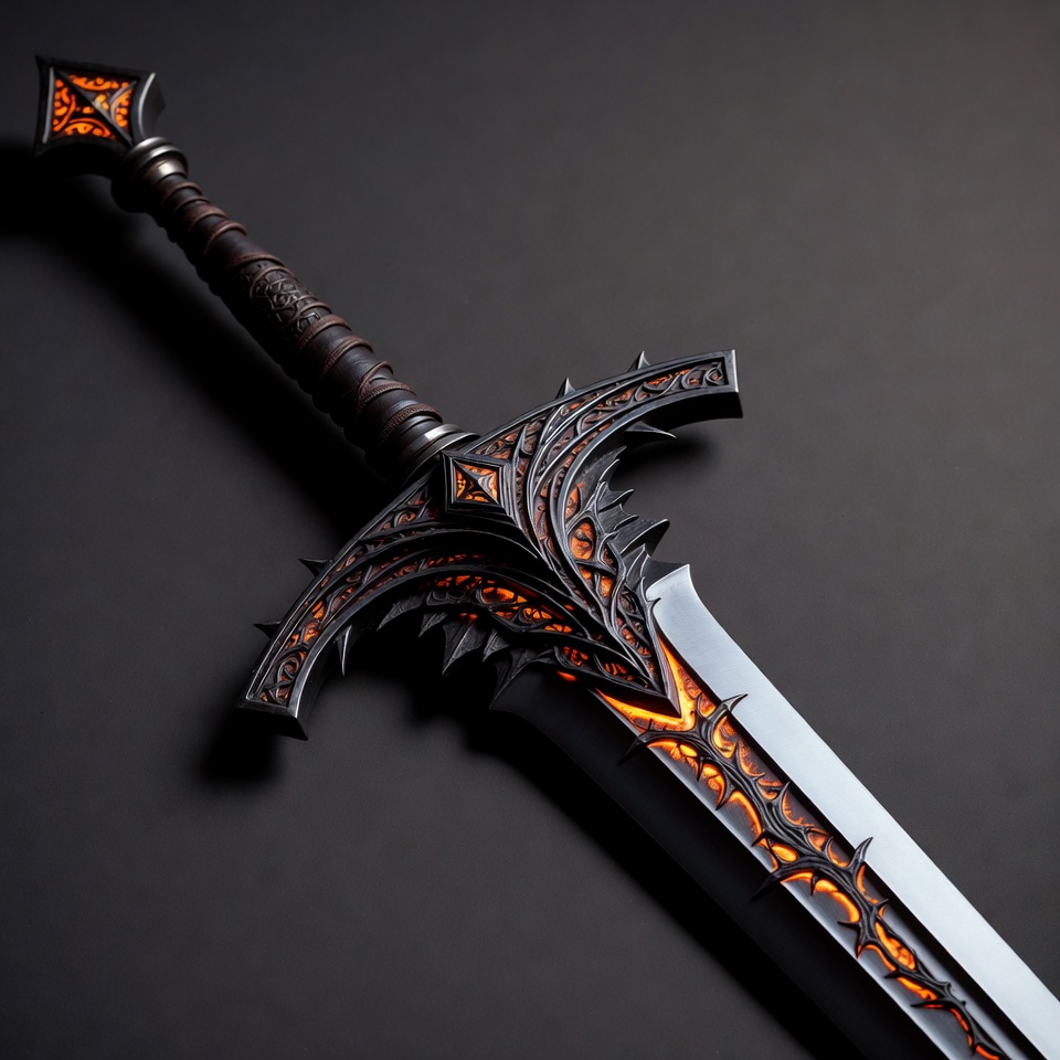 RPG sword, angled view, black sword, blade, closeup sword, dark background, dark fantasy, demonic sword, engraved sword, fantasy sword, fantasy weapon, fiery runes, gaming sword, glowing sword, hilt, intricate design, leather grip, medieval weapon, metallic hilt, orange glow, prop sword, runes, sharp blade, spikes, thorns, sword
