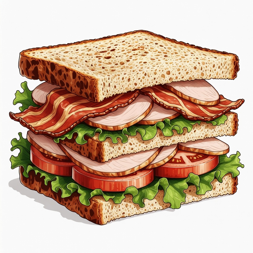 BLT sandwich, bacon, bread, clipart, club sandwich, delicious sandwich, food, fresh ingredients, illustration, isolated background, layered sandwich, lettuce, lunch, meal, stacked sandwich, toasted bread, tomato, turkey, turkey sandwich, sandwich