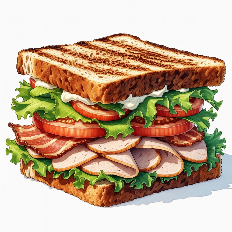 A detailed illustration of a stacked BLT sandwich on a white background. It features toasted bread slices with layers of crispy bacon, turkey slices, fresh lettuce, and tomato rounds topped with mayonnaise. The sandwich is depicted in a realistic painted style with vibrant colors and textures.