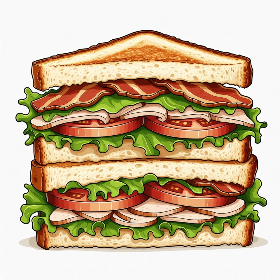 bacon, bread, clipart, club sandwich, deli sandwich, food, fresh ingredients, ham, illustration, isolated background, lettuce, lunch, meat sandwich, stacked sandwich, toast, tomato, triple decker, turkey, BLT sandwich