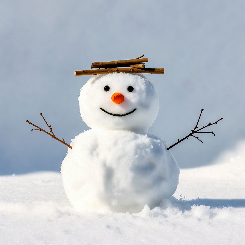 A cheerful snowman stands on a snowy ground with a bright blue sky background. It has a round snow body, black coal eyes, orange carrot nose, and a wide smile. Thin brown twigs form its arms outstretched to the sides and a small hat on top.