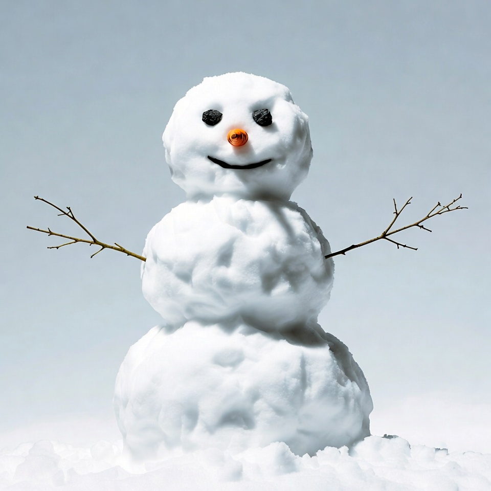 A cheerful snowman stands on a snowy ground with a light blue background. It has a round white body made of snowballs, black eyes, an orange carrot nose, a smiling mouth, and twig arms outstretched. The snowman appears friendly and isolated against the simple backdrop.