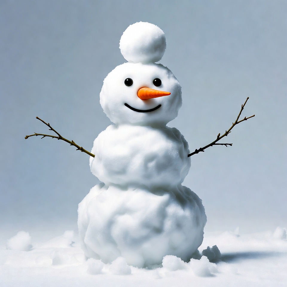 A cheerful snowman stands on a snowy ground with a light blue background. It has three stacked snowballs, black dot eyes, an orange carrot nose, a smiling mouth, and twig arms outstretched. Snowflakes are scattered around its base.