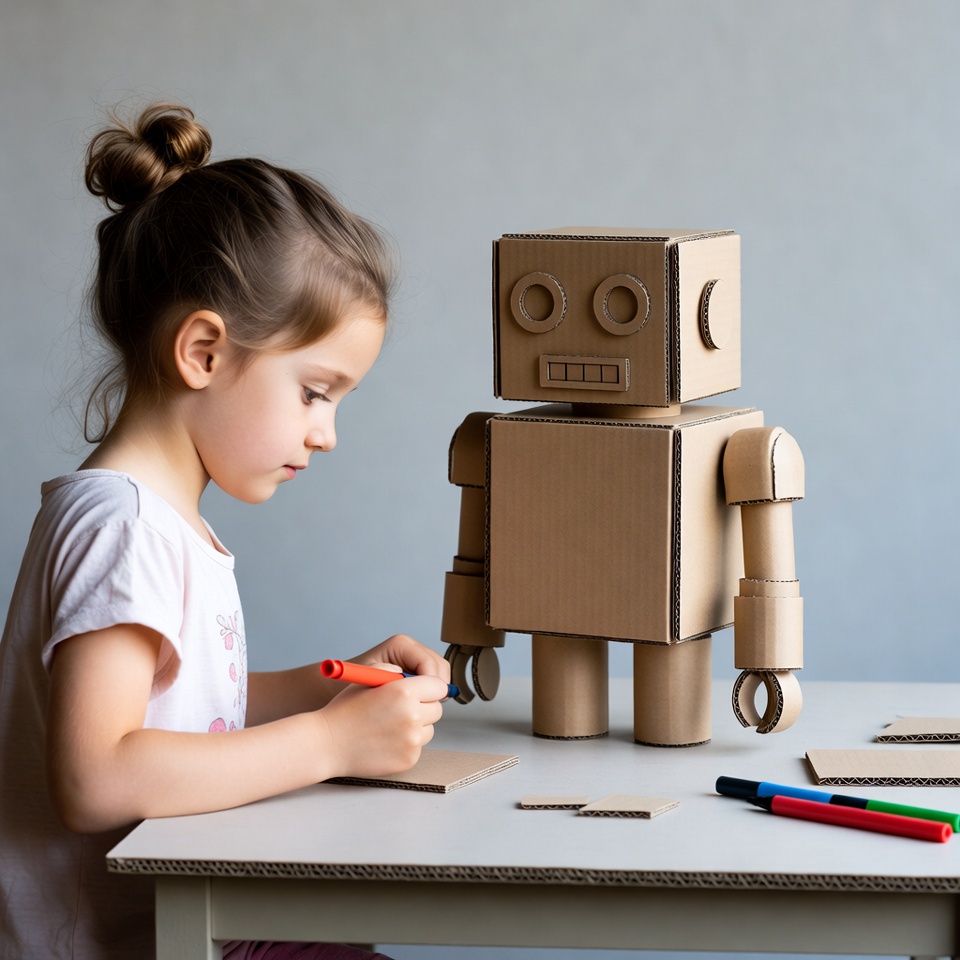 A young girl with brown hair in a bun sits at a table, drawing on cardboard pieces with colorful markers. She is focused on creating a large cardboard robot standing next to her on the table. Scattered cardboard scraps and markers surround the scene on a plain background.