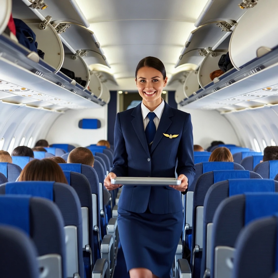 A smiling female flight attendant in a navy blue uniform and tie holds a tray while standing in the aisle of an airplane cabin. Blue passenger seats line both sides, with overhead bins open and some luggage stored. Passengers sit in the seats facing forward.