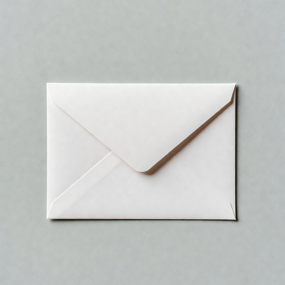 A clean white envelope with a slightly open flap is centered on a smooth light gray background. The envelope features crisp edges and a subtle shadow for depth. It is photographed from a top-down angle with ample negative space around it.