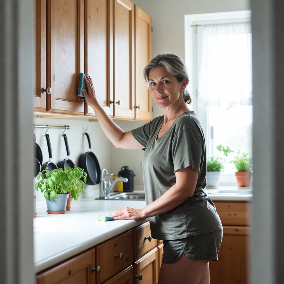 A middle-aged White woman with graying hair stands in a wooden kitchen, scrubbing the upper cabinets with a green sponge. She wears a loose gray t-shirt and shorts, with potted basil plants on the white countertop nearby. Pots hang from a rack and a window with sheer curtains is visible in the background.