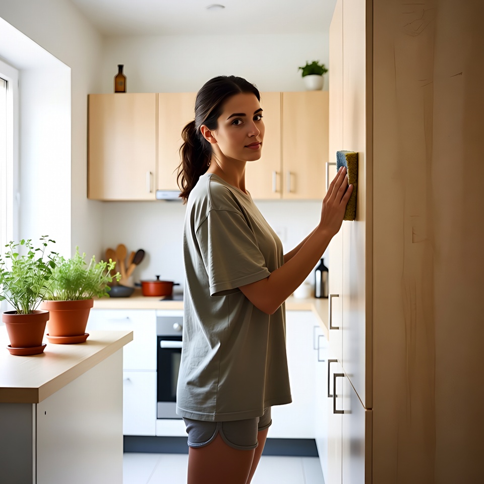 A young woman with dark hair in a ponytail stands in a modern kitchen, scrubbing the side of a wooden fridge door with a yellow sponge. She wears a loose beige t-shirt and gray shorts, viewed from behind at a side angle. The kitchen features white cabinets, potted plants, utensils, and a window with natural light.
