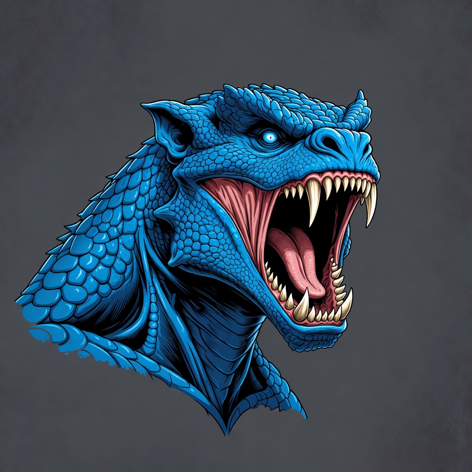 A detailed digital illustration of a fierce blue dragon head snarling with mouth wide open. Sharp fangs and piercing eyes dominate the menacing face, covered in textured scales. The creature is set against a dark gray background.