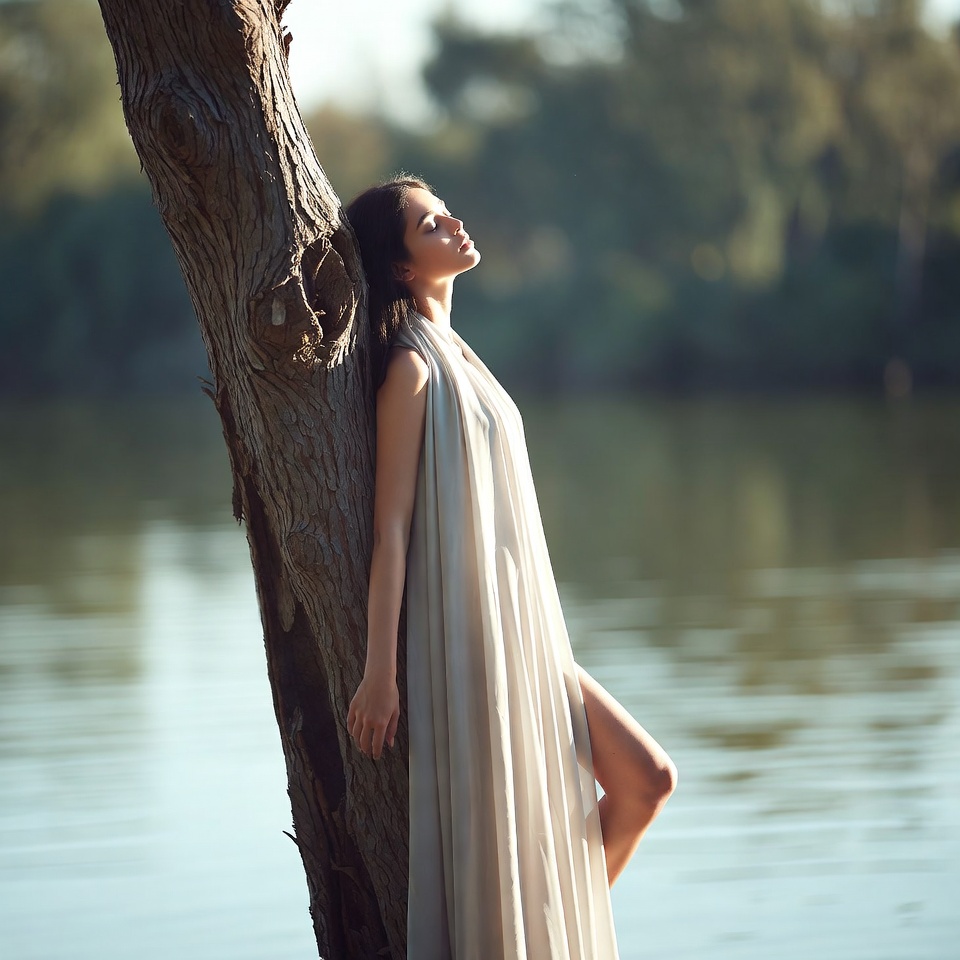 A young Asian woman with long dark hair leans against a large tree trunk, wearing a flowing beige sleeveless dress. She gazes upward with eyes closed, one leg raised and hand resting on the tree. The scene features a serene lakeside background with blurred green foliage and calm water during golden hour light.