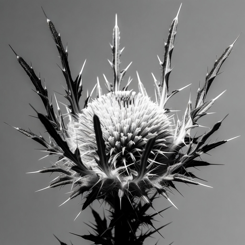 black and white, bloom, bracts, close-up, detailed, flower, gray background, isolated background, macro, monochrome, nature, plant, sharp, spiky, spines, thistle plant, wildflower, thistle