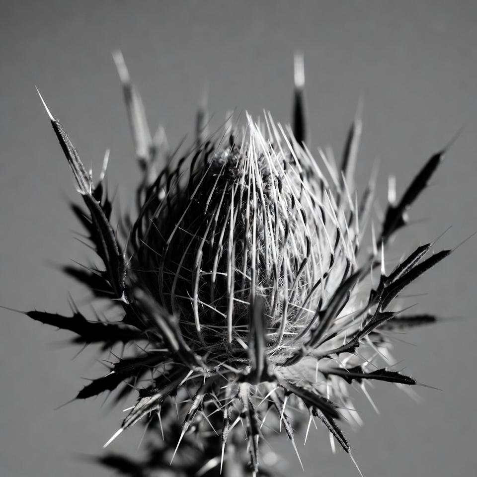 black and white, botany, close-up, detailed, flower, gray background, isolated background, macro, monochrome, nature, plant, spiky, spines, textured, thistle flower, wildflower, thistle