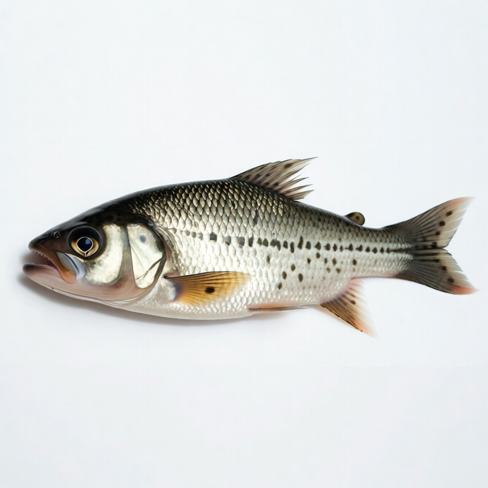 aquatic animal, bass fish, black eyes, fish, freshwater fish, isolated background, orange fins, scales, sea creature, silver fish, striped bass, white background, white bass
