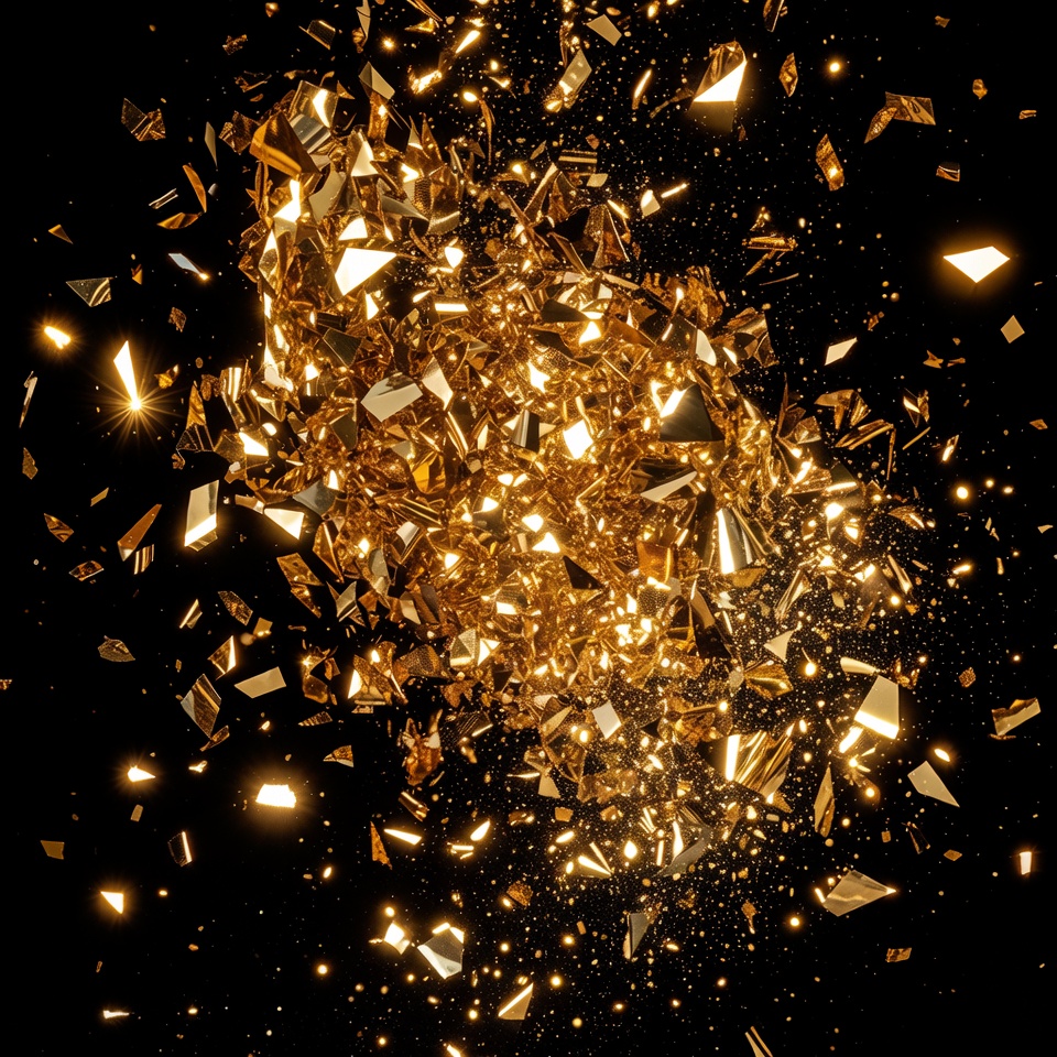3D render, black background, digital art, exploding gold, festive gold, glittering gold, gold burst, gold confetti, gold debris, gold explosion, gold particles, gold scatter, golden fragments, luxury gold, metallic explosion, metallic shards, shiny fragments, shiny metal, sparkling shards, gold shards