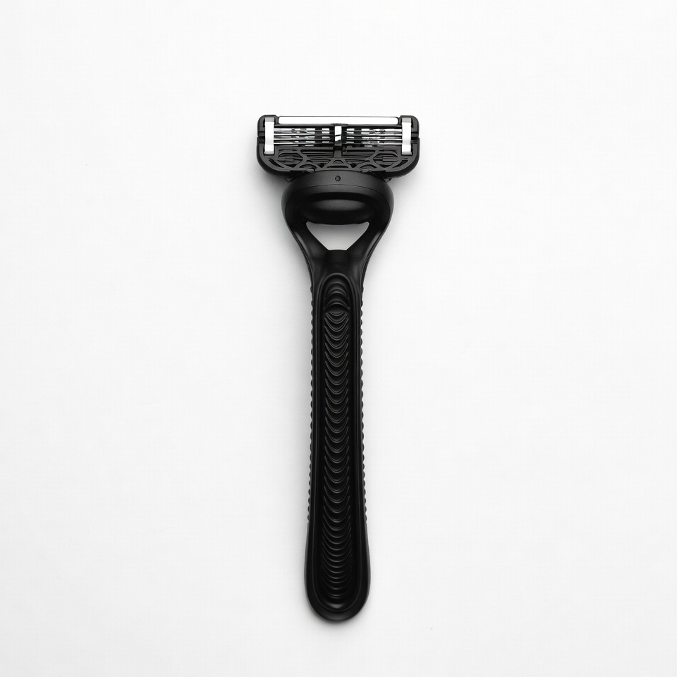 black razor, grooming tool, hygiene product, isolated background, men's razor, multi-blade razor, razor blade, safety razor, shaving accessory, shaving razor, textured handle, white background, razor