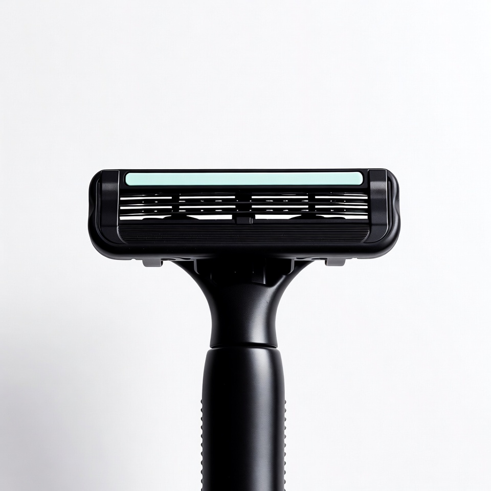 black razor, cartridge razor, ergonomic handle, green strip, grooming tool, hygiene product, isolated, lubricating strip, men's razor, modern razor, multiple blades, safety razor, shaving product, shaving razor, white background, razor