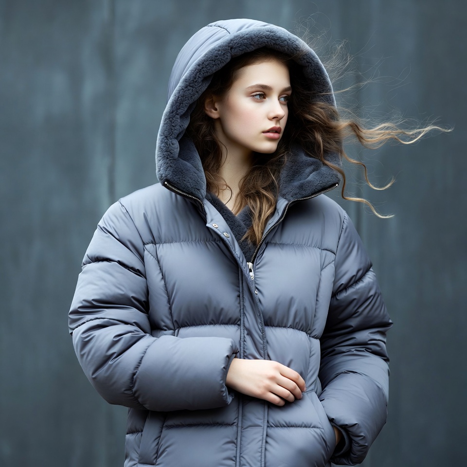 A young woman with long wavy hair stands against a gray wall, wearing a gray puffer jacket with a fur-lined hood. Wind blows her hair dramatically to the side. She gazes thoughtfully with hands clasped in front.