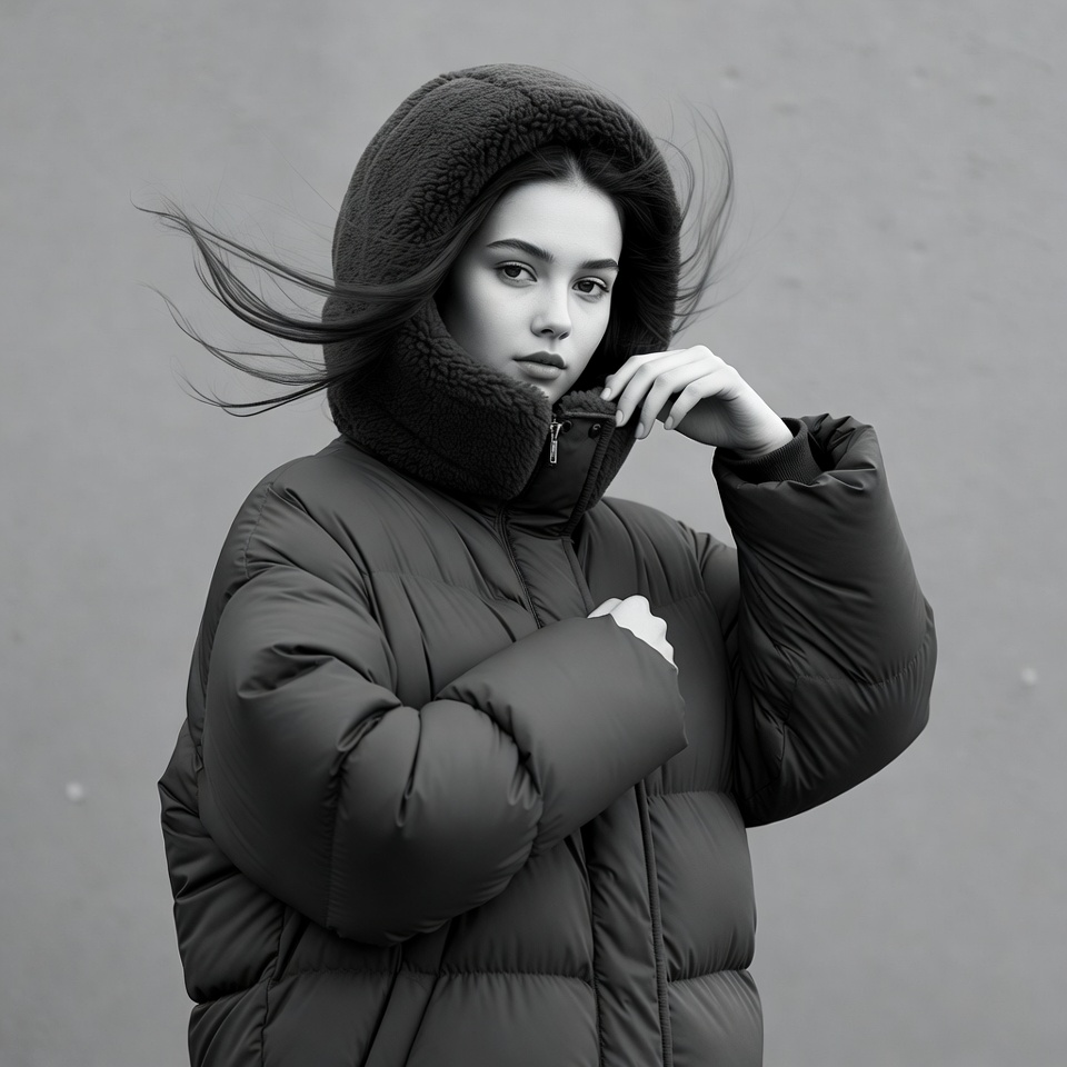 A young woman with long flowing hair stands against a gray wall in a black and white photo. She wears a bulky hooded puffer jacket with a fur-lined hood and has her hand near her chin. Her hair blows dramatically in the wind.