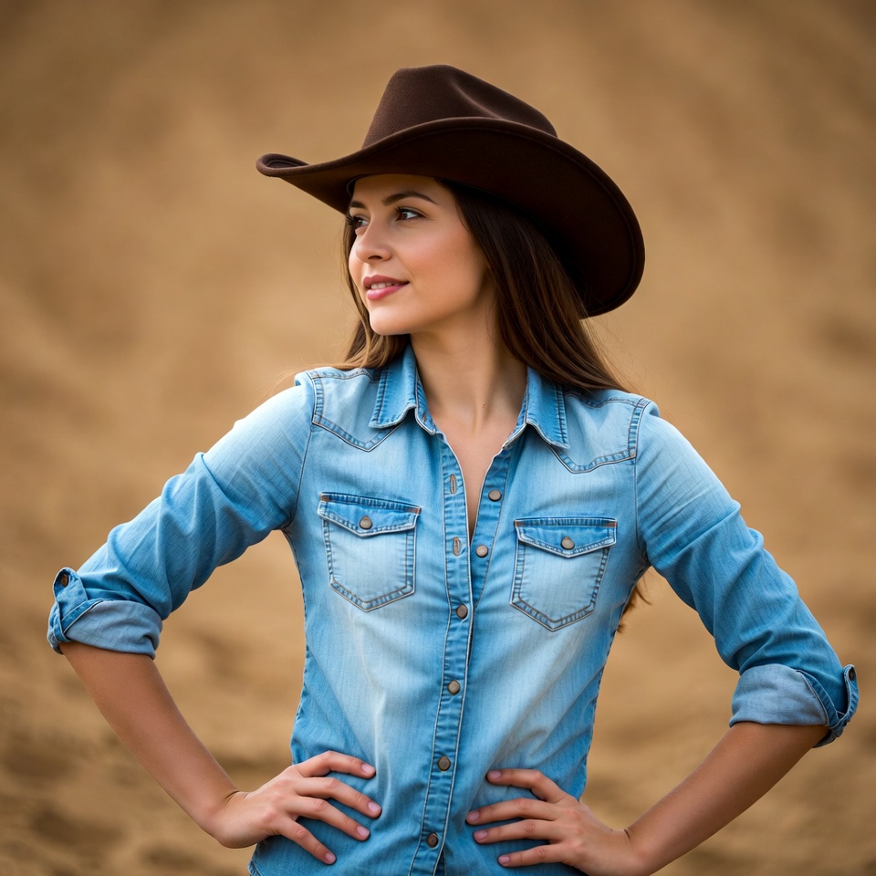 A woman with long brown hair wears a wide-brimmed brown cowboy hat and a light blue denim shirt. She stands confidently with hands on hips, gazing to the side against a sandy dune background. Her expression is relaxed and smiling.