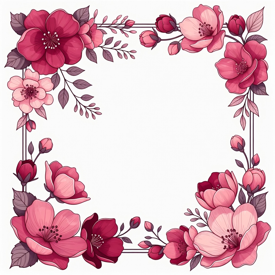 A square frame border features clusters of vibrant pink and red roses with detailed petals and buds. Delicate green stems and leaves extend inward from all four sides, surrounding a central white empty space. The illustration has a watercolor style with soft shading.