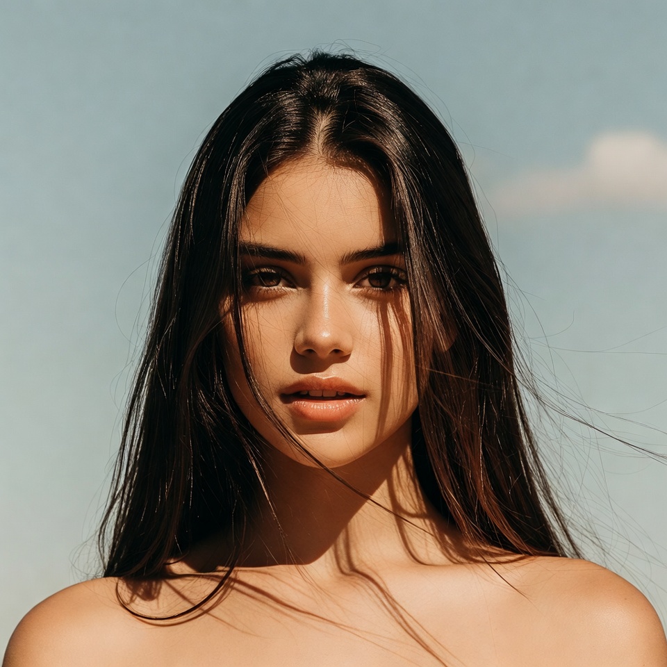 A young woman with long, flowing dark hair gazes directly at the camera against a bright blue sky with clouds. Her face features prominent cheekbones, full lips, and expressive brown eyes. She is topless, with sunlight highlighting her shoulders and hair.