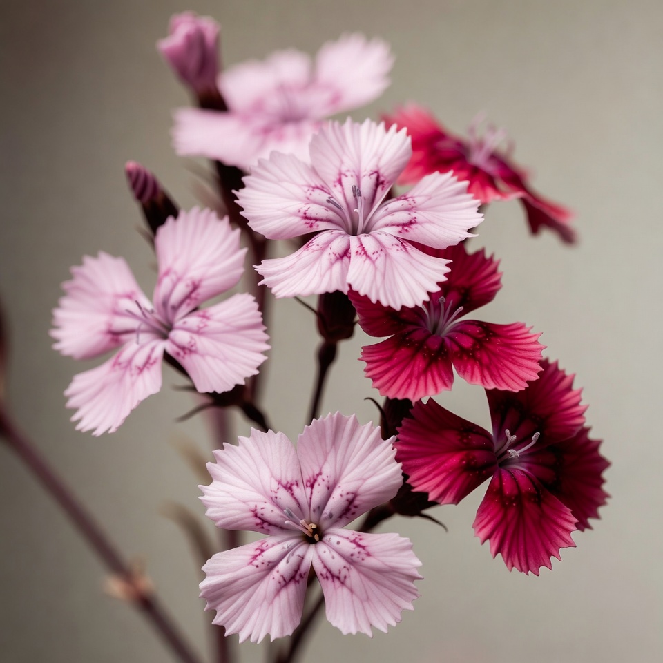 A cluster of delicate dianthus flowers in shades of pink and red grows on thin green stems. The blooms feature fringed petals with white markings and are set against a soft gray background. Several buds and stems add depth to the arrangement.