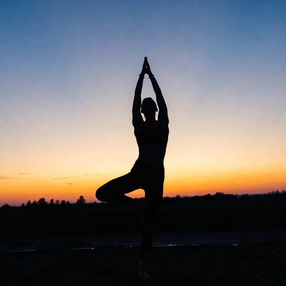 A silhouette of a woman performs the tree pose in yoga against a vibrant sunset sky. She stands on one leg with hands pressed together overhead, wearing a sports bra and leggings. The background features a gradient from blue to orange with distant trees.