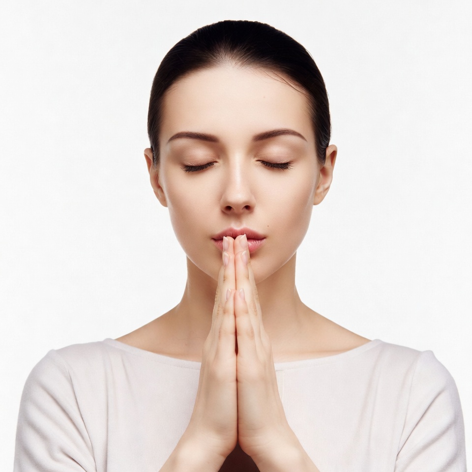 A young woman with dark hair in a bun has her eyes closed and lips pursed in a serene expression. She presses her hands together in a prayer gesture at chest level. She wears a white top against a plain white background.