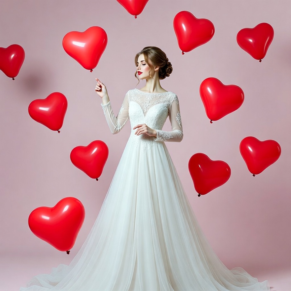 Valentine's Day, White, brunette hair, elegant dress, female, floating balloons, heart balloons, lace sleeves, long dress, pink background, pointing hand, red balloons, romantic, studio photo, updo hairstyle, wedding dress, white gown, woman, bride