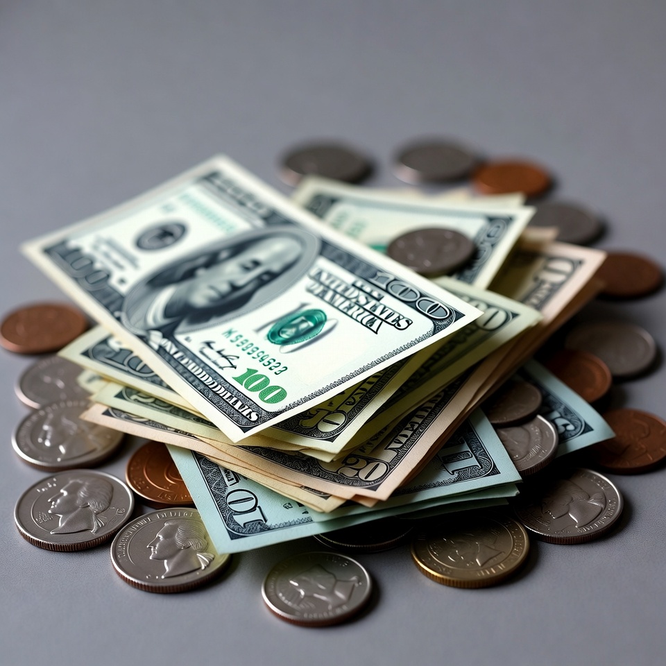 A pile of US hundred dollar bills in various denominations is stacked on a gray surface. Surrounding the bills are numerous silver and copper-colored coins, including quarters and pennies. The money is arranged in a close-up composition against a plain background.