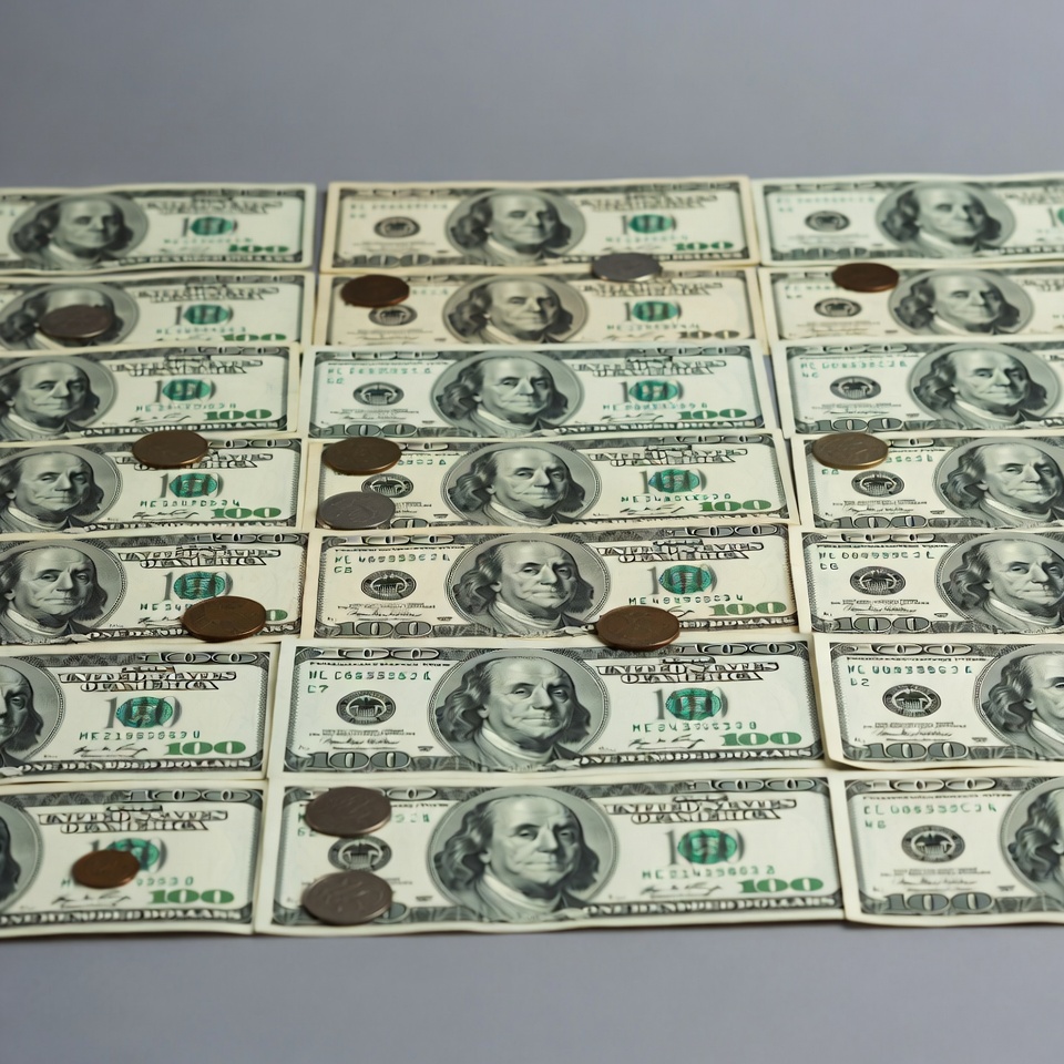 Multiple US $100 bills are stacked and arranged on a gray surface. Several gold-colored coins are scattered among the bills. The bills prominently feature Benjamin Franklin's portrait.