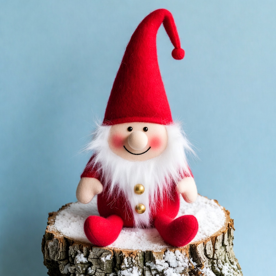 A cute felt gnome with a tall red hat, white beard, and rosy cheeks sits on a snowy tree stump. It wears a red outfit with gold buttons and red shoes. The gnome is positioned against a solid blue background.