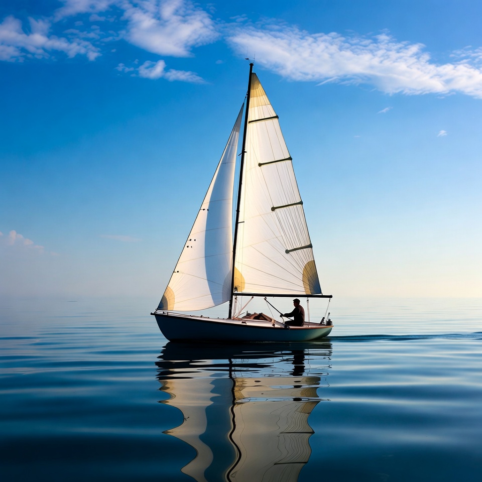 A white sailboat with yellowed sails glides across a calm blue sea under a partly cloudy sky. A man sits at the stern steering the boat. The boat's reflection is clearly visible in the still water.