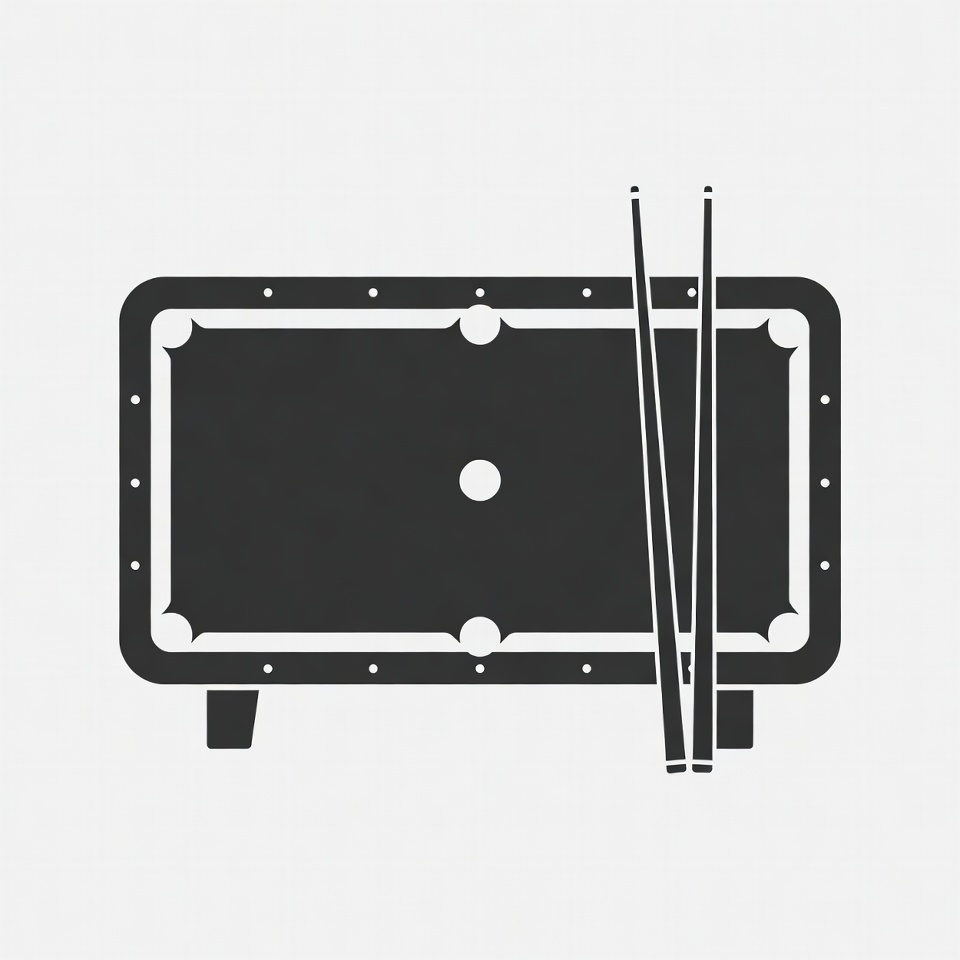 A black silhouette illustration of a rectangular pool table with pockets and a central spot. Two cue sticks lean against the side of the table. The image features a simple outline design on a light background.