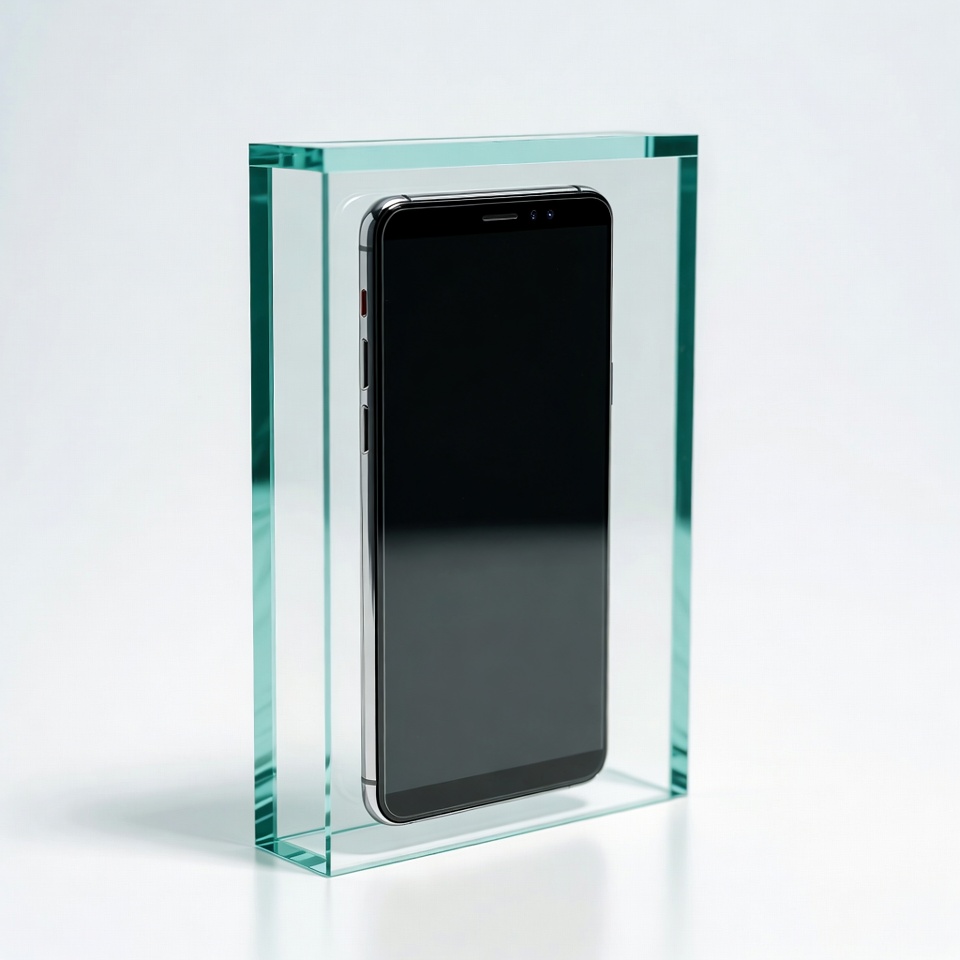 acrylic case, black phone, cell phone, clear case, display case, gadget showcase, isolated background, mobile phone, modern phone, phone display, tech gadget, transparent case, upright phone, smartphone
